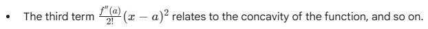 • The second term f′(a)(x−a) relates to the linear approximation (tangent line) and the slope.