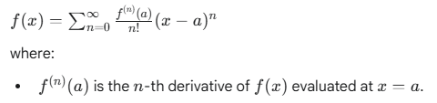 Taylor Series: A Taylor series for a function f(x) centered at a point a is an infinite sum of terms, where each term is derived from the function’s derivatives evaluated at that single point a. The general