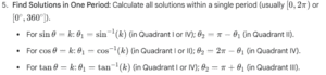 - Write the General Solution: Add multiples of the function’s period to each solution found in step 5 to represent all possible solutions.